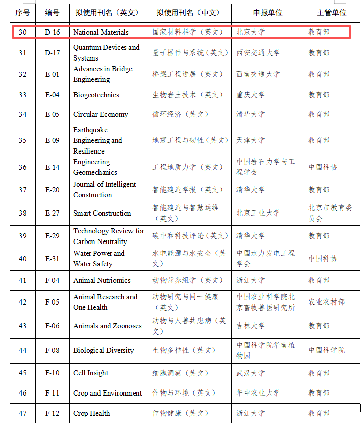 自主创办的《National Materials》入选中国科技期刊卓越行动计划高起点新刊项目。