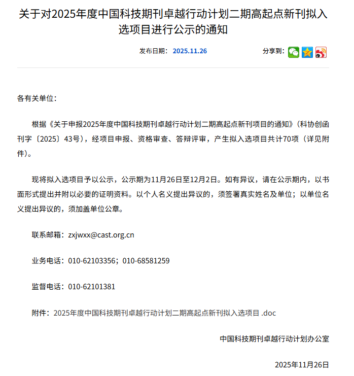 近日,中国科技期刊卓越行动计划办公室印发《关于对2025年度中国科技期刊卓越行动计划二期高起点新刊拟入选项目进行公示的通知》,通知指出经项目申报、资格审查、答辩评审,产生拟入选项目共计70项。其中,日韩性爱