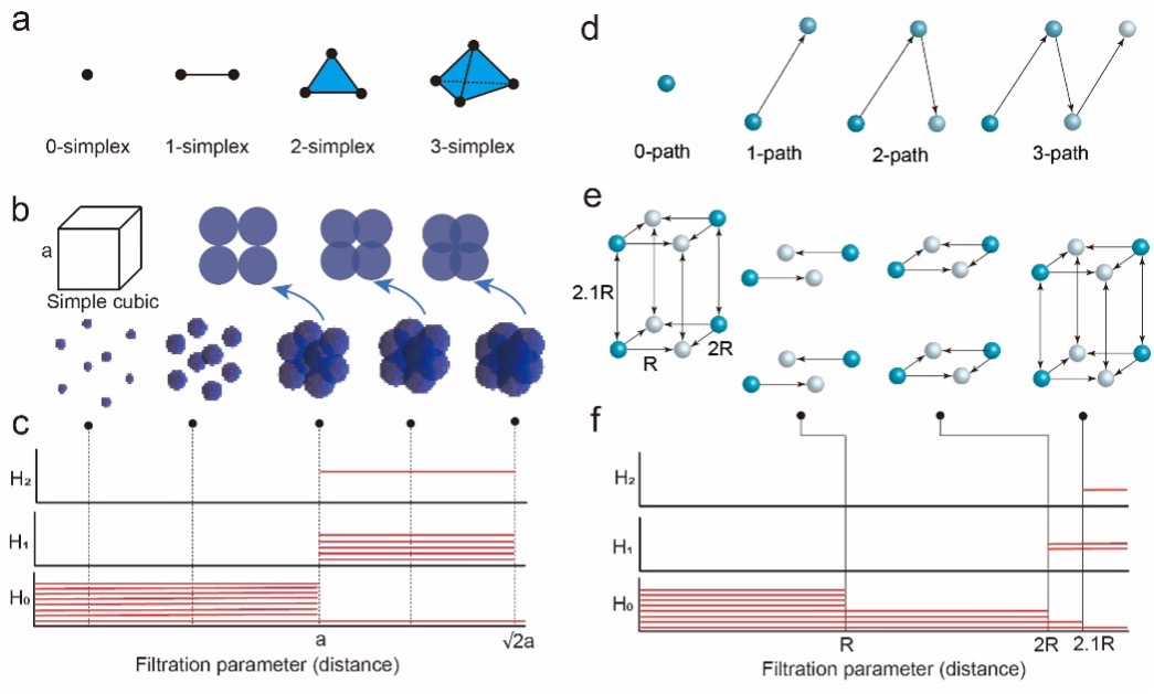 该研究基于代数拓扑理论,将材料的原子结构抽象为数学复形(simplicial or path complexes),并通过计算其拓扑不变量(如Betti数、循环密度等),实现对结构形貌、连通性与孔洞特征的多尺度量化。相较于传统经验型结构描述符(如配位数、局部环境参数)或“黑箱式”深度学习特征,该方法具备更强的结构敏感性与物理可解释性,能够有效捕获材料体系中与性能相关的高维几何与连通信息。